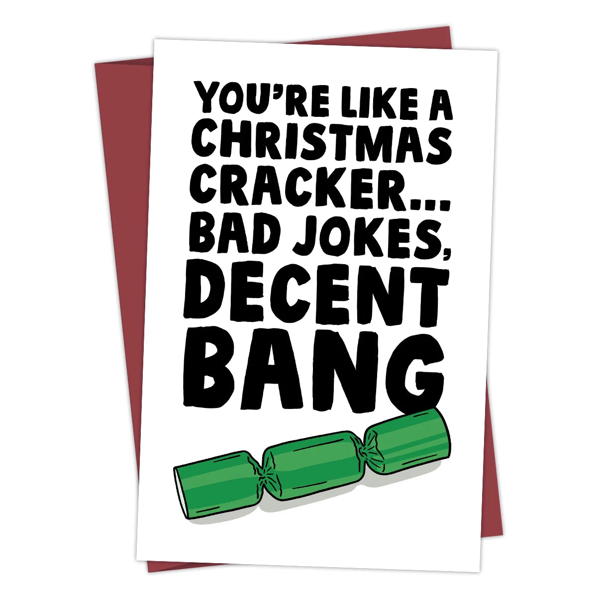 Pour un vœu de Noël qui explose de bonne humeur (et de sous-entendus), cette carte compare votre destinataire à un cracker de Noël : mauvaises blagues mais un “bang” tout à fait respectable. Un humour malin, un brin coquin, parfait pour un partenaire ou un ami très complice !
